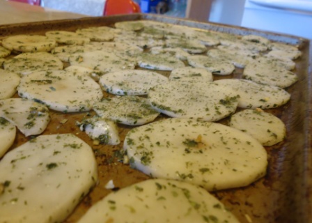| Potato 'chips' for dinner. I peeled them, sliced them really thin, coated with a little olive oil and Spinach & Herb Seasoning. Then, baked for about 15 minutes. |